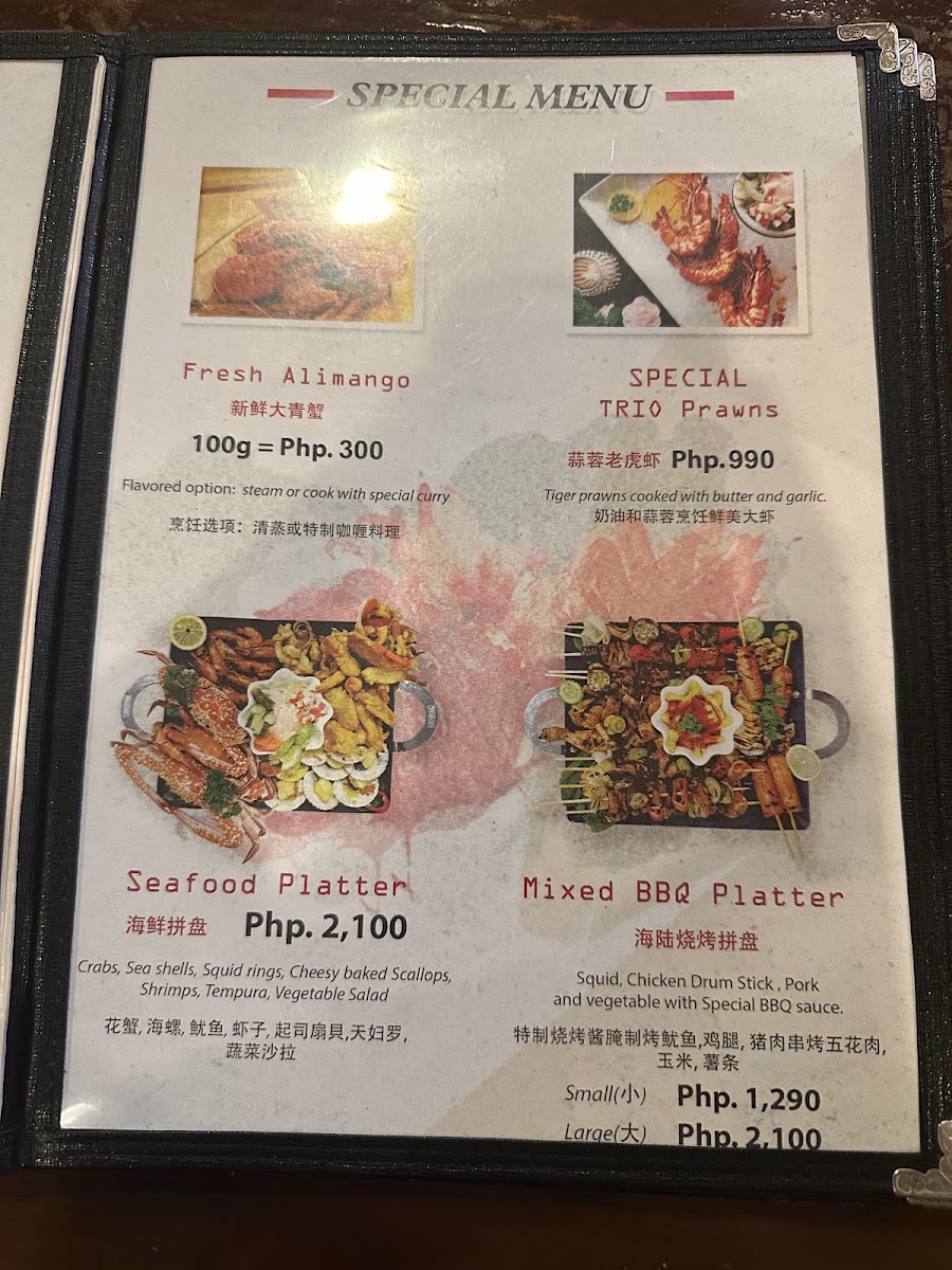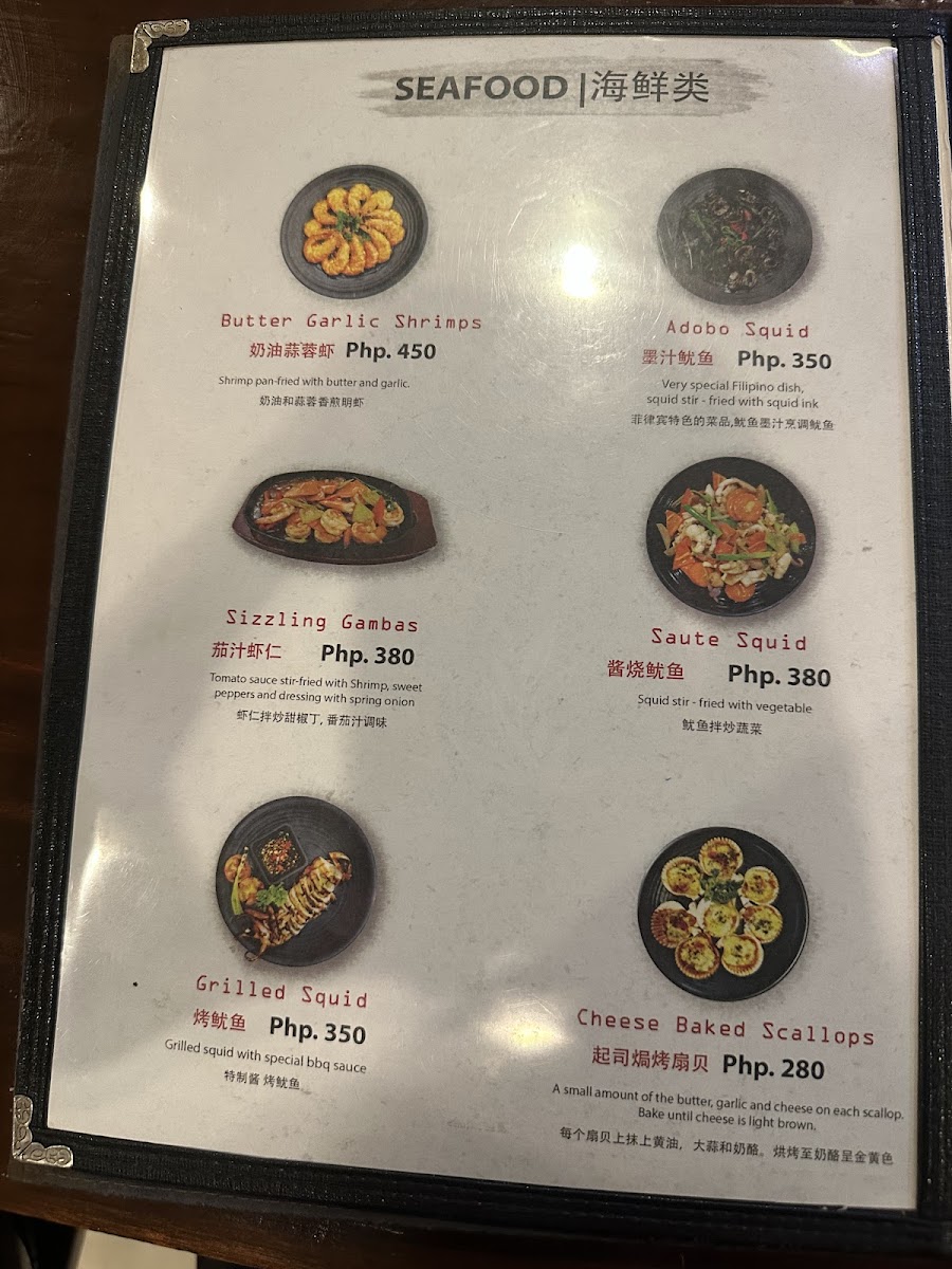 Whether you're gathering for a relaxed lunch or enjoying a leisurely dinner, the menu’s variety makes it easy to share and savor. Dishes such as sizzling gambas, curry alimango, and cheese baked scallops add warmth and depth to the meal, fitting naturally with the open, welcoming atmosphere of the restaurant. Drinks like mango shakes or refreshing beer complement the food, making the overall experience feel well-rounded and comforting.
